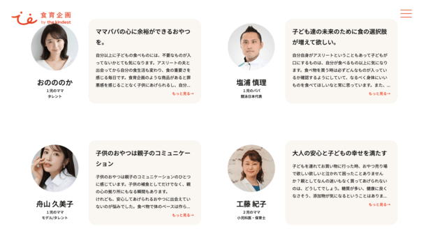 『食育企画 by the kindest』特設サイト内では、共同開発者である長友夫婦や子育てしながらご活躍されているアスリートや専門家などの著名人の方々から寄せられたメッセージを公開しています。今後、新商品の情報や食育に関するイベント情報など順次公開していきますので、ご期待ください。