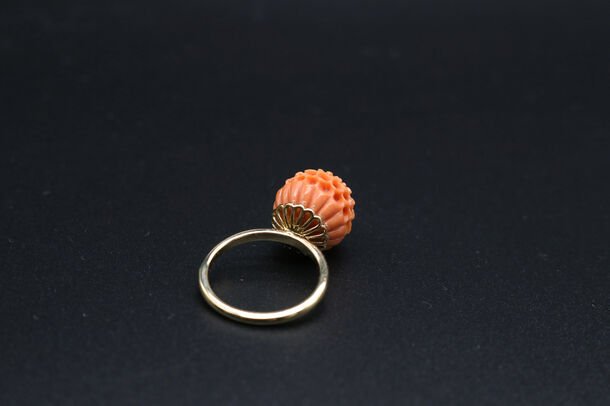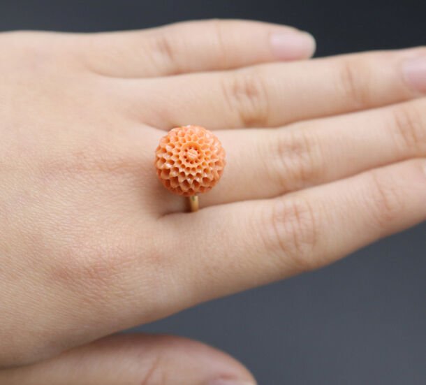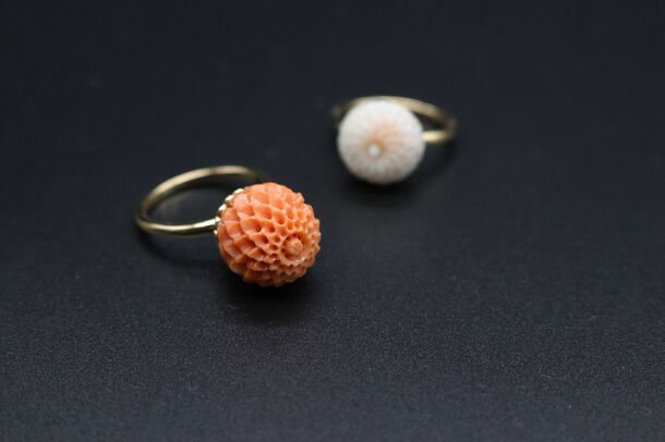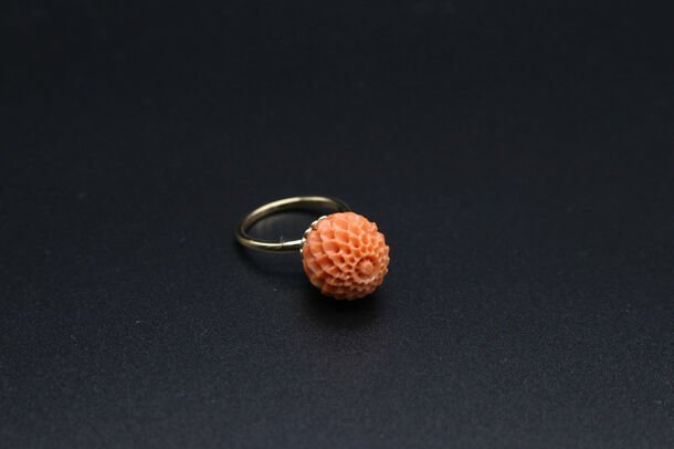 古より女性の守り石として珍重され、かんざしや帯留めなどの装飾品で愛されてきた珊瑚。珊瑚の一大産地高知県の花彫職人に依頼し、特に高い技術力が問われる「菊彫り」の珊瑚を使用、土台には昔、帯留めによく使われていた「菊透かし」をいれてリングにしました。