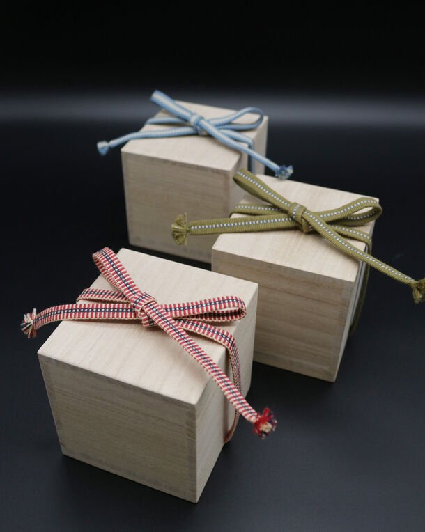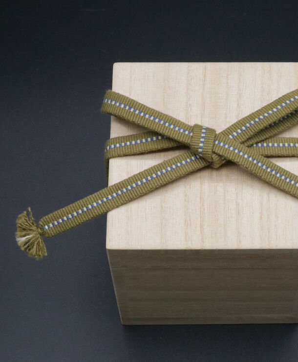 木目が美しく光沢があり、中に入れた物を湿気から守るという特徴がある桐箱を、香川県伝統工芸士・道久 常夫氏に依頼、茶道具などの桐箱でも使用する真田紐をつけて、高級感のあるジュエリーBOXを制作しました。