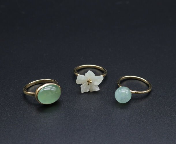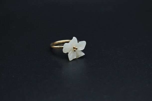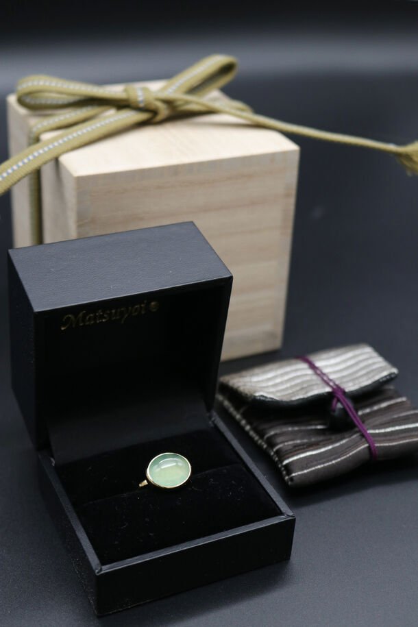 日本神話でも名高く、国石である糸魚川翡翠。その中でも特に希少な「ろうかん石」と呼ばれる色が淡く均一で高い透明感を持つ石を使用。硬度が固く加工が難しい糸魚川翡翠を、地元糸魚川市の翡翠加工職人に依頼し、日本の意匠「菊」の透かしや、「花蕾」、満開の「開花」に見立ててリングにしました。