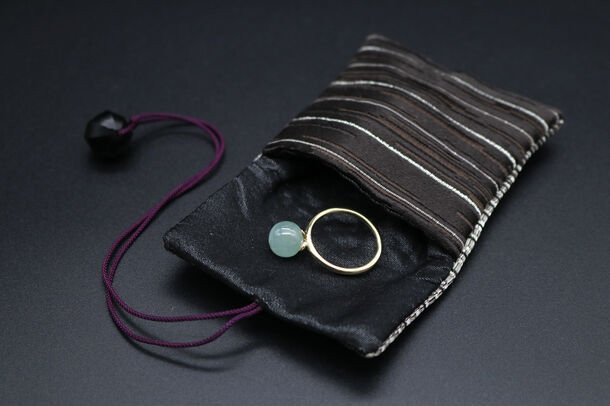 日本のジュエリーにふさわしい携帯ポーチにするため、日本の織物の最高峰ともいえる西陣織、その中でもそのすべらかさと鮮やかな陰翳の「八段繻子」の緞子を使用し制作しました。