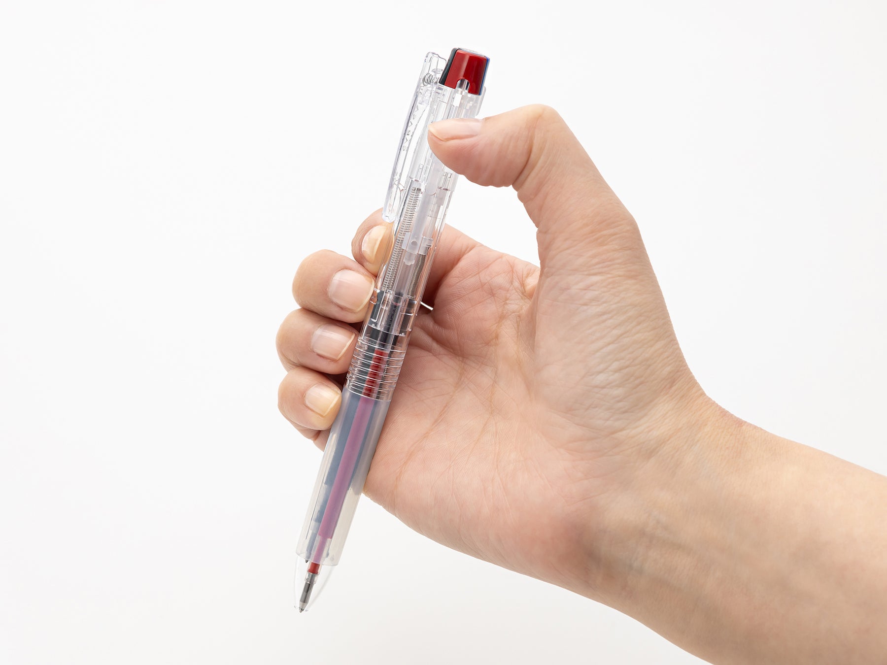 従来の多色ペンの構造は、中芯にスプリングが巻きついていて、スリムにしようと中芯を中央に寄せると、スプリング同士が絡まるため、中央に空間を設ける必要があり、スリム化できませんでした。ボディをスリムにするため、スプリングを中芯の隣に配置する「サイドスプリング機構」を開発し、中芯を中央に寄せる配置を可能にしました。従来と同じ中芯を使用しながら、軸径の 8%スリム化と 7%軽量化(いずれも従来品対比)を実現し、スリムで握りやすい 3 色ジェルボールペンが誕生しました。