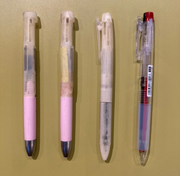 ジェルボールペンの単色タイプは多くの方に使用されていますが、多色タイプはほとんど普及していません。油性の多色ペンに比べてボディが太い、または筆記距離が短いことが、お客様にとって使いづらくなっているのではないかと考えました。ジェルボールペンの良さを保ちつつ、使いやすい多色ペンを開発することでお客様に喜んでいただけると考え、課題解決に向けた検討チームを発足させました。
