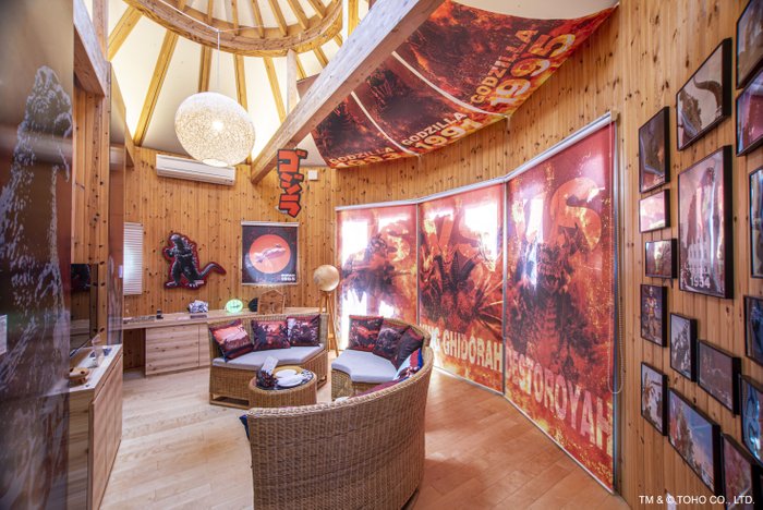 室内には、歴代ゴジラと人気怪獣たちが描かれたインテリアやタペストリー、窓越しに見える実寸大ゴジラの一部、さらに、それらに光の照射で見え方が変わる特殊加工を施すことによって、昼・夜で異なった室内の雰囲気をお楽しみいただけます。室内に隠れた全ての怪獣たちを見つけ出すことで豪華特典が手に入る“特別任務”に挑戦していただくなど、昼夜通してお愉しみいただけるお部屋です。